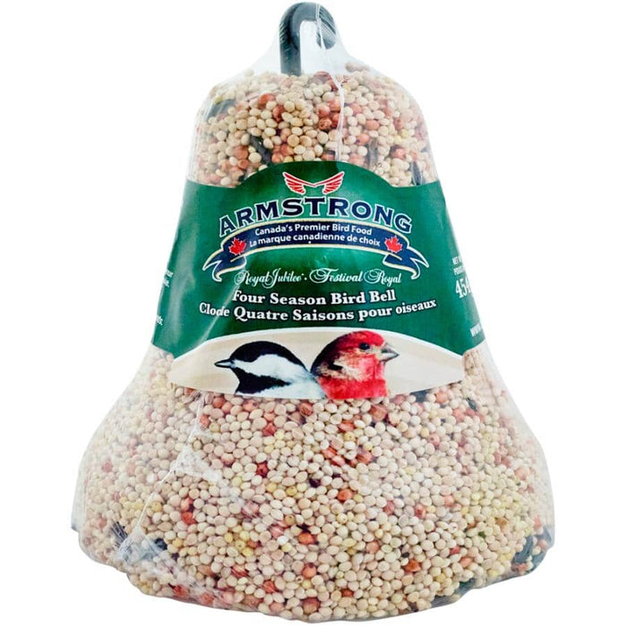 Armstrong Royal Jubilee Four Season bird bells are a pressed seed, bell shaped treat. Features a built-in hook and contains high quality seeds that are designed to bring many small songbirds to your backyard for a nutritious treat. Just unwrap and hang for a quick and easy way to feed the birds. 454 g.