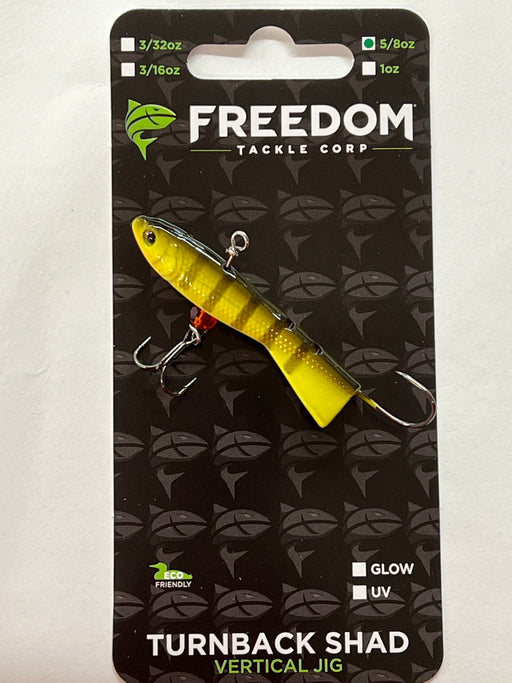 FREEDOM TURNBACK SHAD PERCH LURE 5/8 oz Realistic 3D design Twist-free line tie Premium black nickel hooks All metal one-piece construction